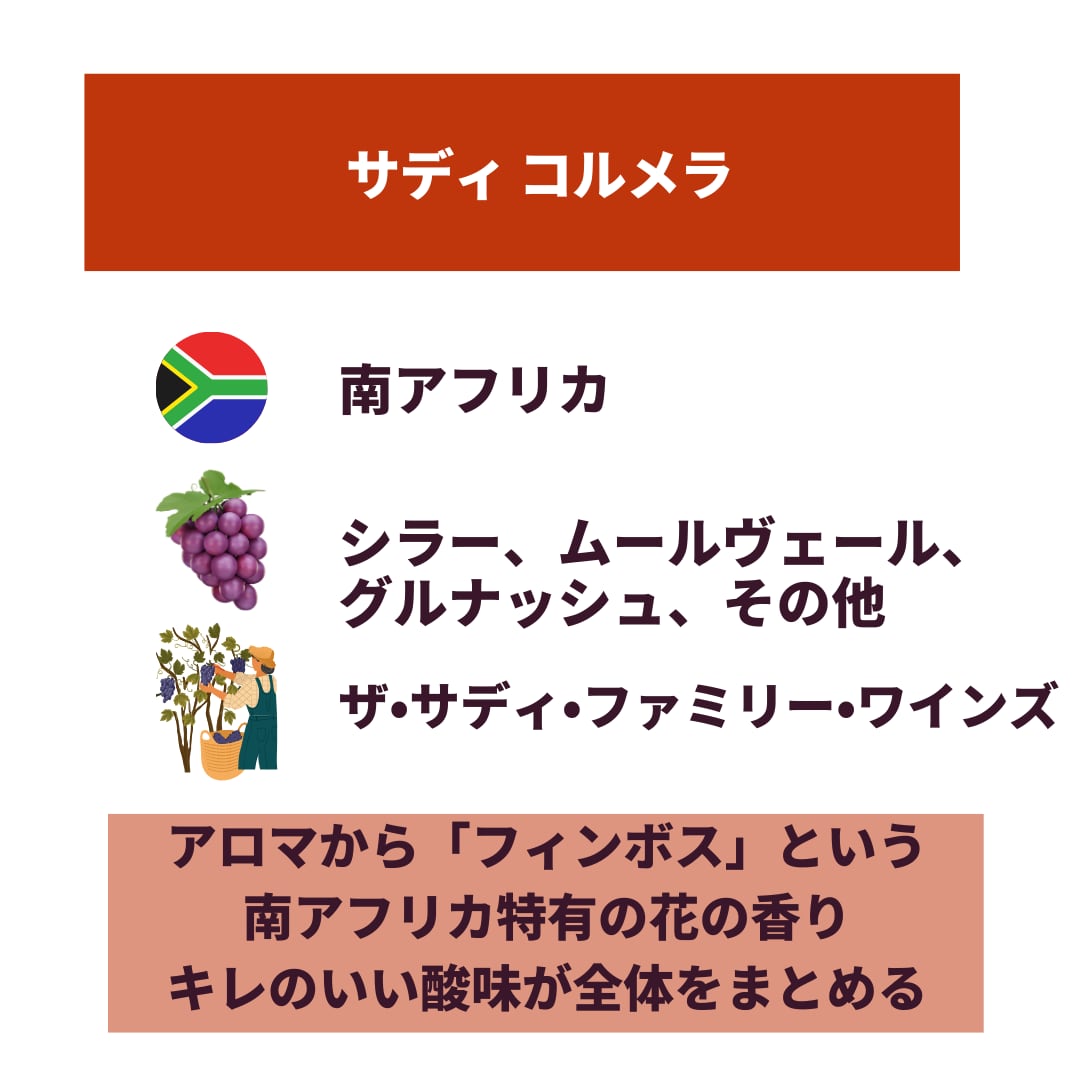 アロマから「フィンボス」という南アフリカ特有の花の香りがするといいます。他にはバラなどの華やかな香り。柔らかなタンニンが広く広がり、キレのいい酸味が全体をまとめます。
