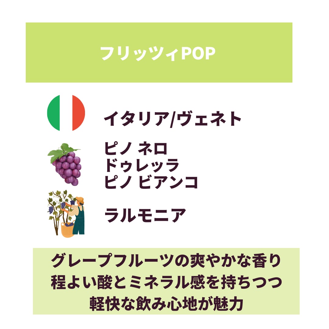 誰でも楽しめるワインを目指し、飲み心地を追求するヴェネトの自然派「ラルモニア」。素直に美味しいと感じる「POP」シリーズの「フリッツィ」です。ピノ ネロ60%、ドゥレッラ20%、ピノ ビアンコ20%のブレンド。グレープフルーツの爽やかな香り。程よい酸とミネラル感を持ちつつもまるでジュースを飲んでいるような軽快な飲み心地が魅力。毎日でも飲みたい微発泡ワインです!